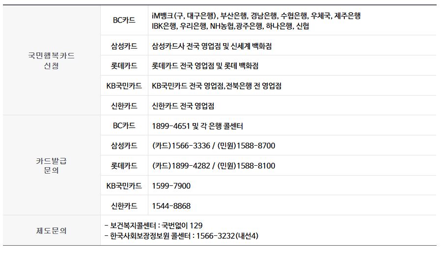 국민행복카드는 각 카드사에서 발급이 가능합니다. 신청 및 문의는 아래의 각 카드사에 문의하시면 됩니다.